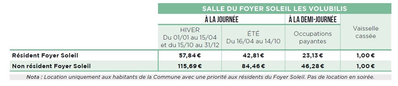 La location de la salle du Foyer Soleil est réservée en priorité aux résidents du foyer soleil. Elle peut être louée selon les disponibilités, aux habitants de la commune uniquement.